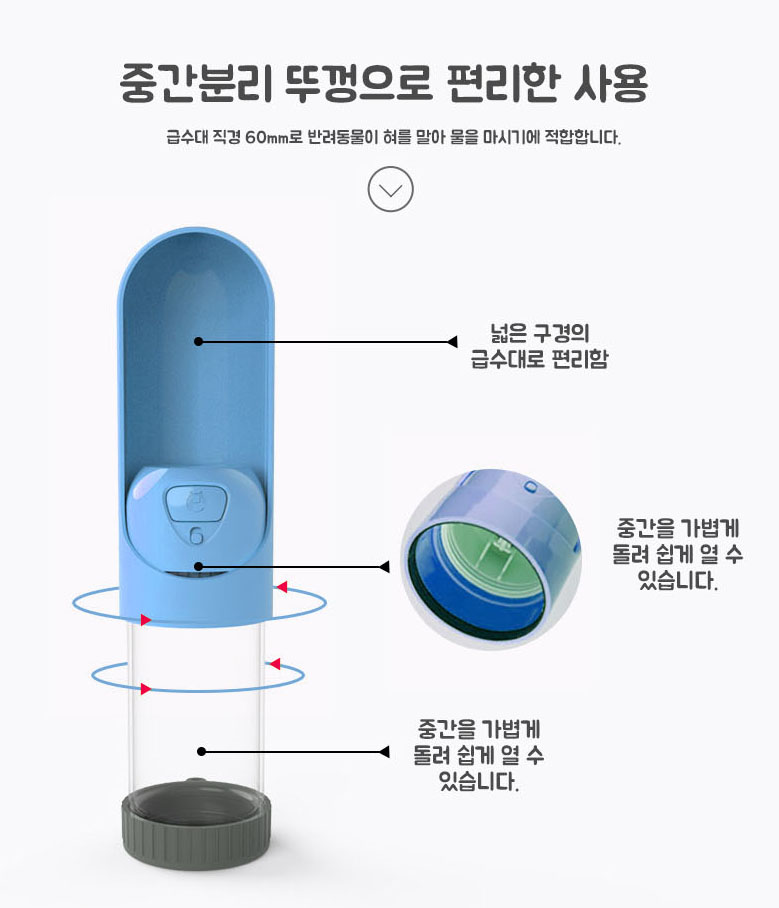나이스굿 반려동물 급수물통, 산책물통은 직접 접촉이 되는 급수대는 구경이 넓고, 물통과 급수대 분리가 가능하여 물채우기나 세척에 매우 용이합니다.