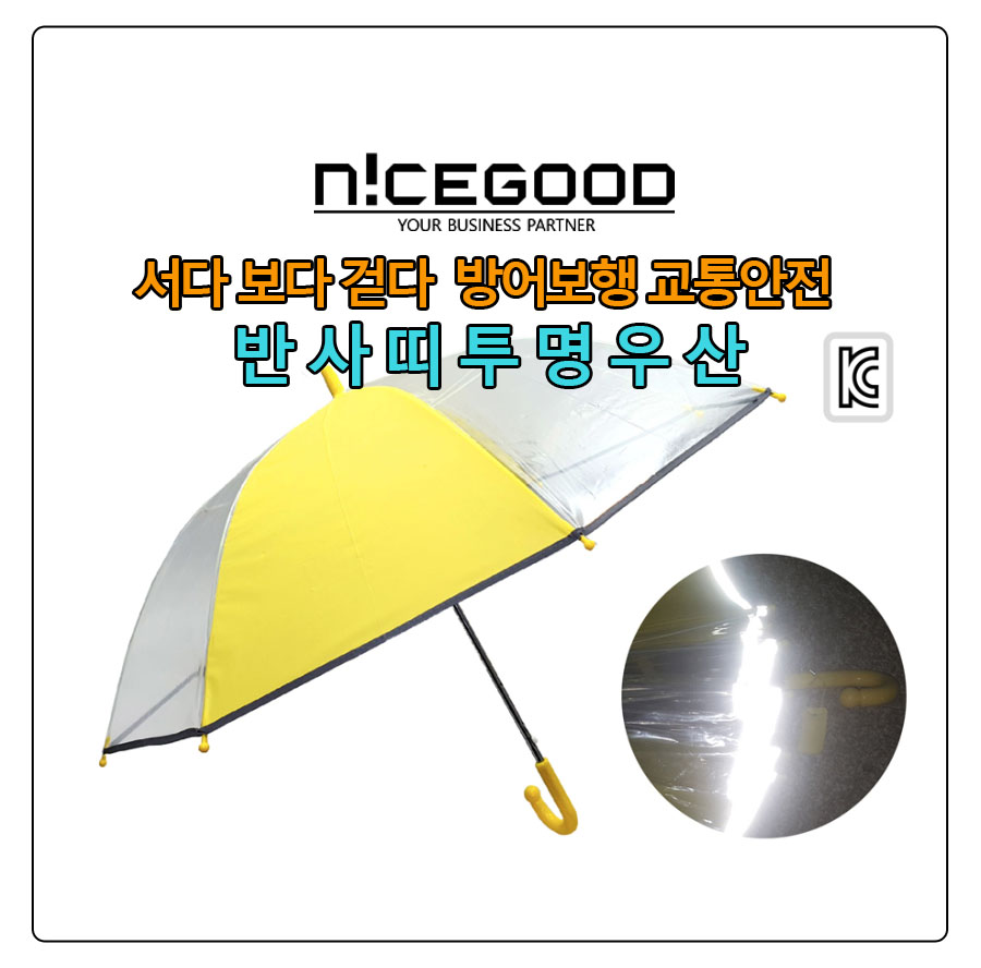 안전우산, 투명우산, 반사띠우산으로 보행안전, 교통안전, 어린이교통안전 #정책 등의 홍보물품이나 굿즈로 진행하실 경우 나이스굿에서 제공하는 추가 스티커 제작 무료서비스(최소 500장 이상) 등의 혜택과 제품 단가할인, 추가할인, 무료디자인, #무료배송 등을 제공합니다.