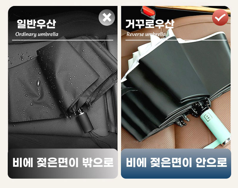 비에 젖은 면이 안쪽으로 가는 거꾸로 역방향 접이식 우산으로 편의성까지 겸비한 보행, 보행자 안전 우산입니다.