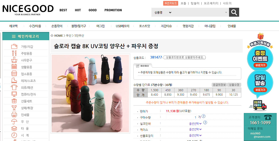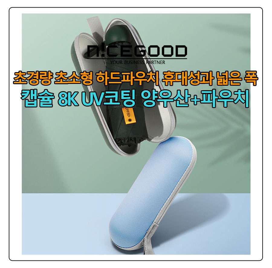 나이스굿 홈페이지에서 위에 소개드린 "초소형 초경량 하드파우치 증정 캡슐 8살대 UV코팅 양우산" 의 상품코드 381477을 입력하셔도 됩니다.