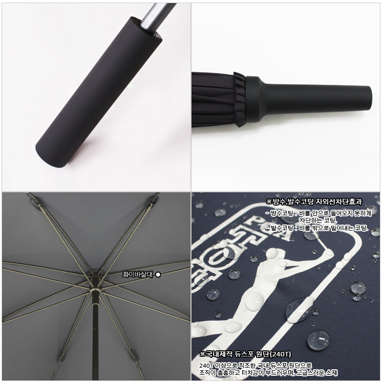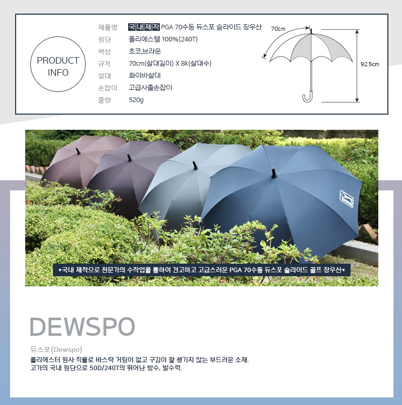 국내산 장우산 PGA TOUR 70은 고급 듀스포 원단을 사용해 구김이 적고, 부드러우면서도 가벼운 원단으로 8개의 살대에 전문가의 수작업을 통해 견고하게 제작됩니다.