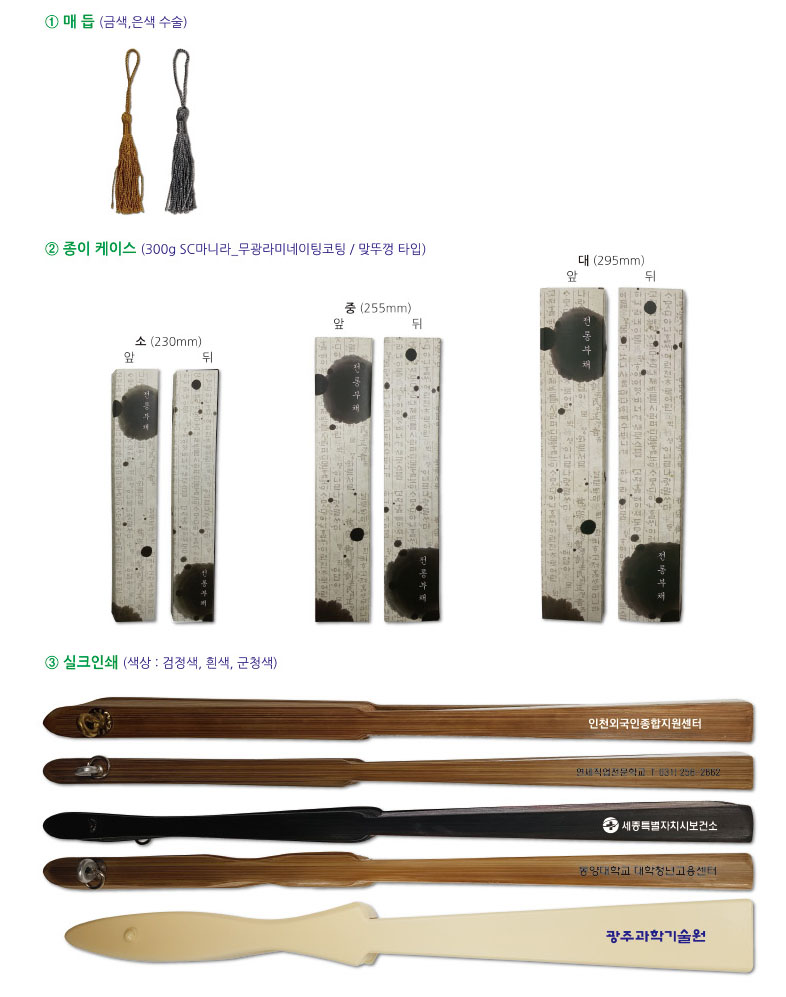 외국인 방문선물 방문기념품으로도 매력적인 아이템이지만, 창립기념일 행사, 직원 선물로도 선호하시는 기념품이기도 합니다. 인쇄 외에도 손잡이 끝부분 매듭이나, 전통문양 전용케이스 등의 옵션을 선택 추가하실 수도 있습니다.