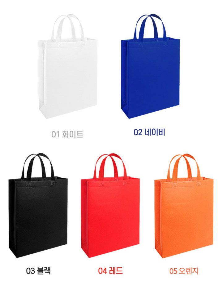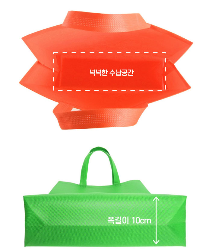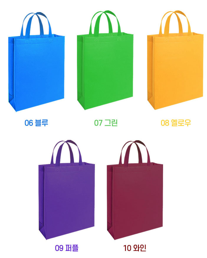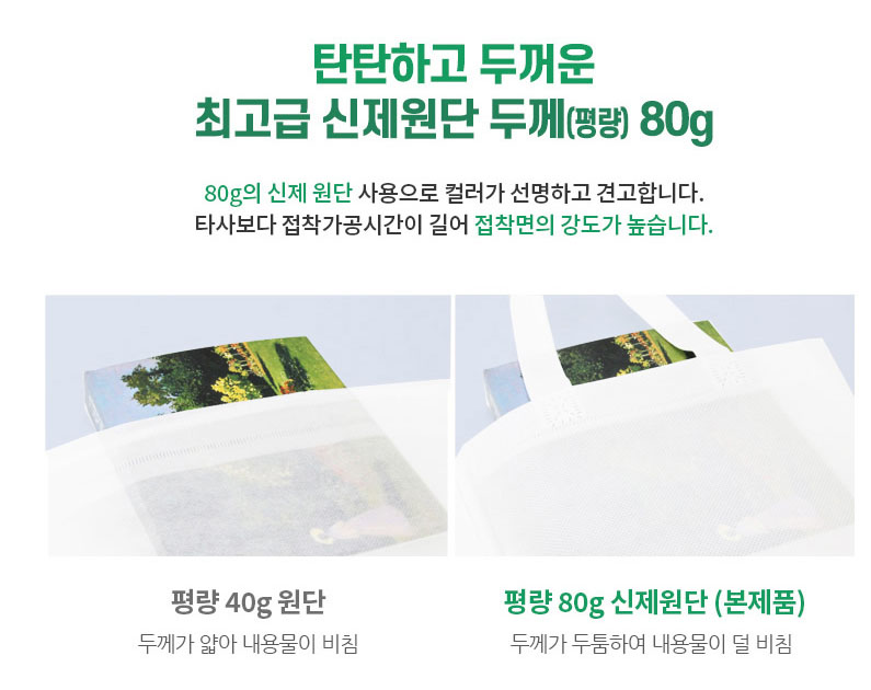 탄탄하고 두꺼운 80g의 신제 원단 사용으로 컬러가 선명하고 견고하고 일반 저가 부직포 가방보다