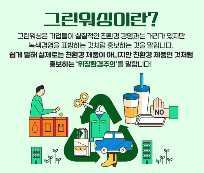 그린워싱이랑 그린과 세탁을 뜻하는 워싱이 합쳐진 단어로 근거없는 광고나 광고문구로 소비자를 기만하는 행태를 뜻합니다.