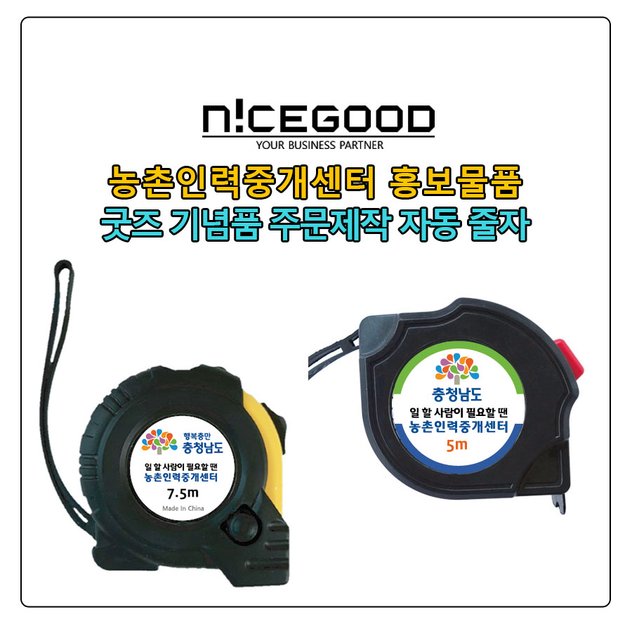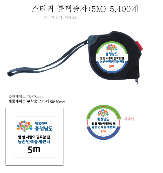 #농촌인력중개센터 홍보물품 굿즈 기념품 주문 제작 자동 줄자는 농협중앙회충남세종본부에서 의뢰를 주셨고, 최초 7.5m로 의뢰를 주셨으나, 납기 내에 4,300 여개의 재고 확보가 불가능하여, 빠른 수급이 가능한 5m 안전 마감이 장점인 블랙 줄자를 5,400개로 추천드려서, 최종 진행이 되었습니다.