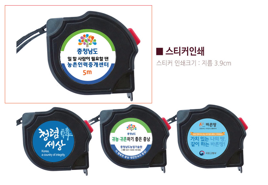 홍보용 굿즈 기념품 인쇄 줄자의 경우 제품에 바로 인쇄는 불가하여, 원형 스티커를 제작 후 사이즈에 맞에 부착이 되어 출고가 됩니다.