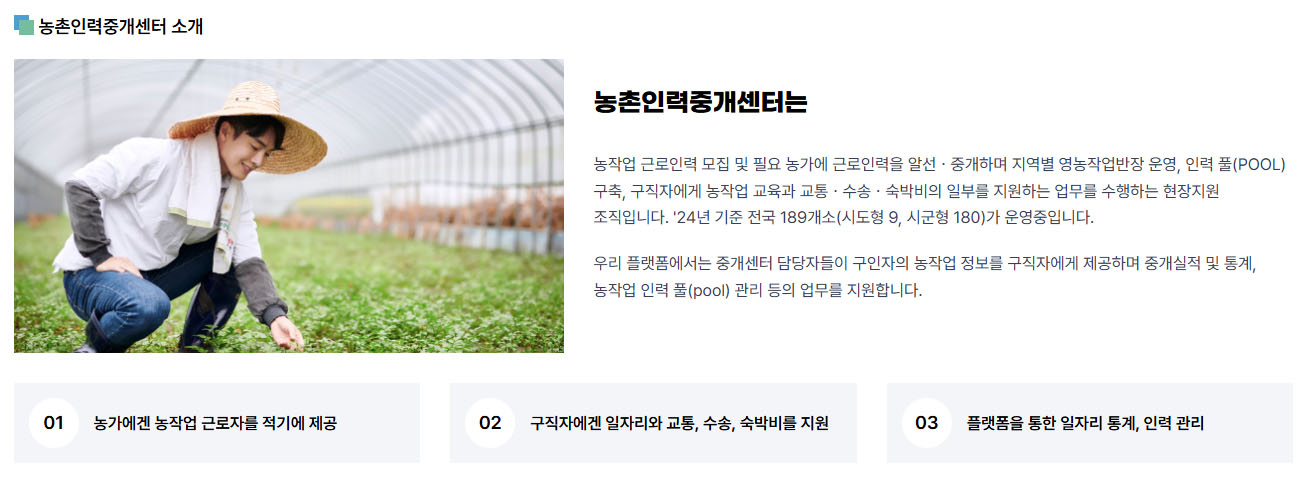 - 인력 알선 외에도 숙소 제공, 교통비 지원 등 농업 종사자들을 위한 다양한 지원을 제공합니다.
