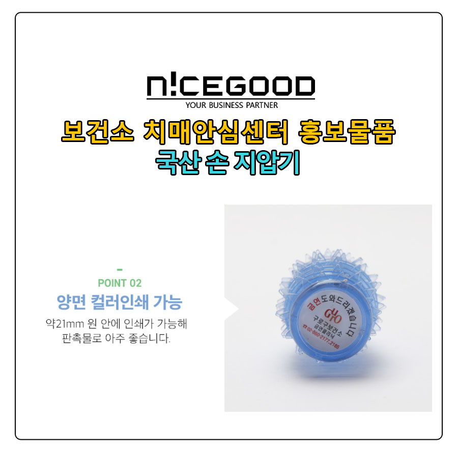 보건소 치매안심센터 홍보물품 국산 손 지압기는 양쪽에 스티커로 홍보문구나 기관명, 로고 등을 부착해서 출고하는 제품으로, 특히 보건소나 #노인복지기관 #요양병원 등에서 많이 찾으시는 홍보용 제품입니다.