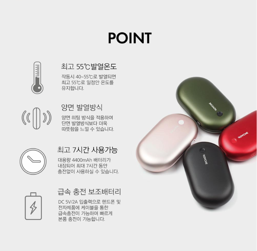 추운 계절, 당신의 손과 마음을 따뜻하게 만들어줄 핫 아이템!손난로에 보조배터리 기능을 넣어 언제 어디서나 사용할 수 있는 실용적인 제품입니다.