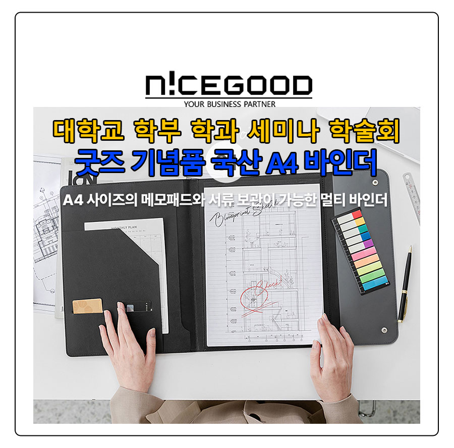 대학교 학부 학과 세미나 학술회 굿즈 기념품 국산 A4 바인더는 카드, 명함 수납공간 2개와 서류수납 1개, 태블릿과 서류 수납 1개, A4 줄노트 꼿이 1개와 함께 투명포켓 1개까지 활용도와 실용성에 중점을 둔 아이템입니다.
