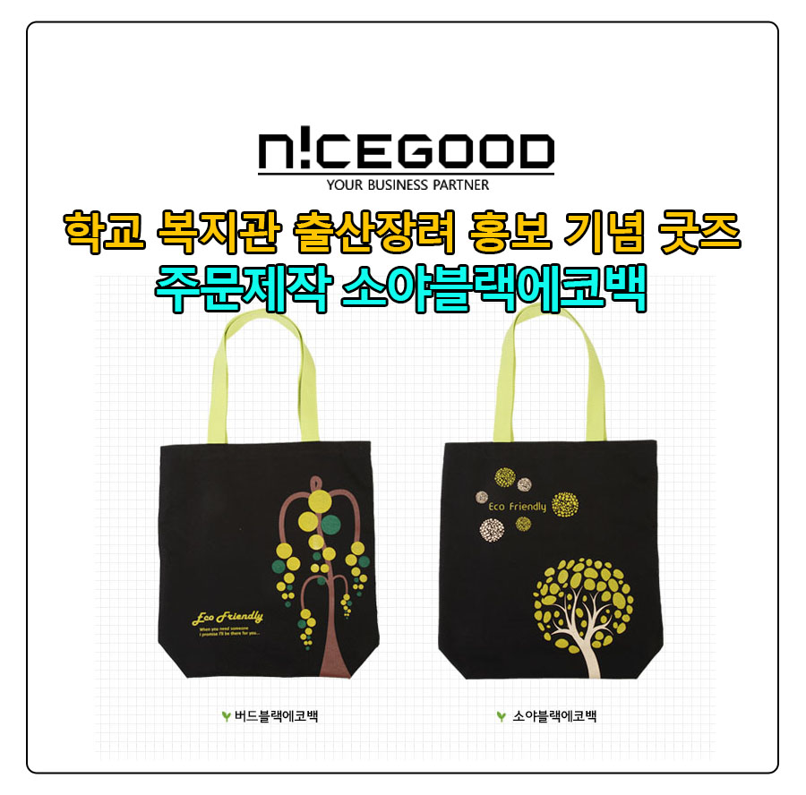 학교 복지관 출산장려 홍보 기념 굿즈 주문제작 소야블랙에코백 인쇄는 앞면의 기존 디자인이나 문구를 피해 적용은 가능하나, 앞면의 색상과 100% 맞출 수 없는 관계로 인쇄 후 기존 내용과 인쇄한 내용의 색상의 이질감이 발생할 수 있어, 넓은 인쇄 영역까지 제공하는 뒷면 인쇄를 추천 드리고 있습니다.