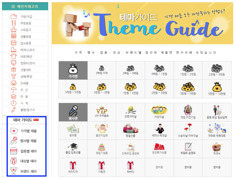 나이스굿 테마별 카테고리에는 가격대별, 행사별, 업종별, 대상별, 브랜드별 테마 카테고리와 제품별 카테고리가 잘 정리되어 있어 쉽고 빠르게 원하시는 제품을 선택하실 수 있으며,