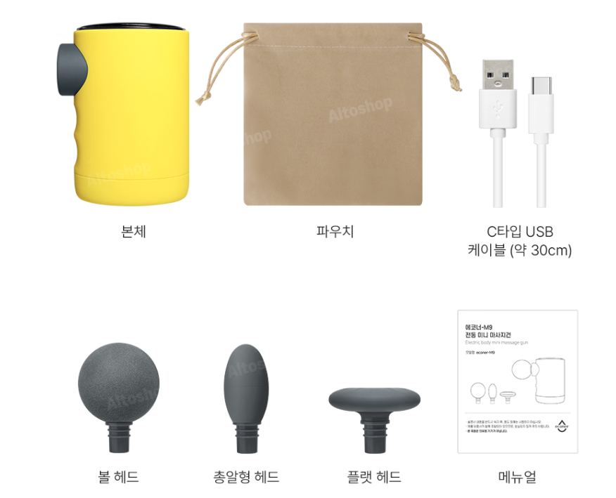 본체와 함께 위에서 안내드린 전용파우치, C타입 충전케이블, 볼과 총알, 플랫으로 구성된 3종 헤드와 매뉴얼까지 기본 제공 됩니다.