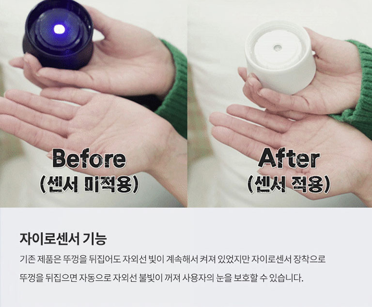 눈 보호 자이로센서 기능을 탑재해 뚜껑을 뒤집어도 인위적인 자외선에 노출이 되지 않도록 자동으로 센서가 OFF 되는 세심한 배려까지