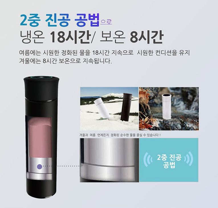 이중 진공 공법으로 보냉 18시간, 보온 8시간이 가능하여 여름에는 시원한 물을, 겨울에는 따뜻한 물을 언제든