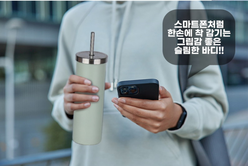 67mm의 슬림한 직경을 적용해 일반적인 스마트폰 사이즈보다 좁은 그림갑을 제공하며, 일반 보틀보다 더 많은 음료를 담을 수 있어, 가벼움과 내구성을 유지하면서도 충분한 내용물의 용량 550ml를 담을 수 있습니다.