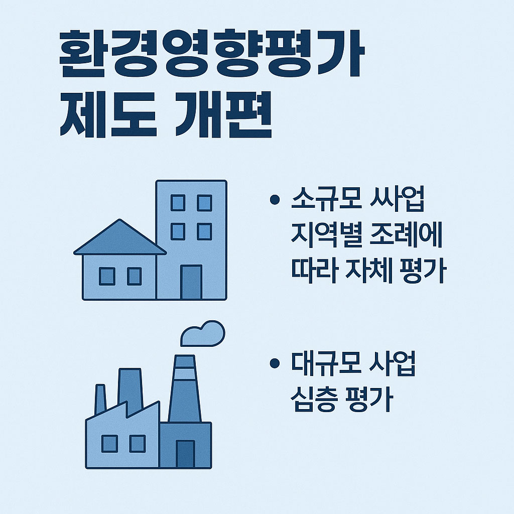 #환경영향평가제도 개편: 소규모 사업은 지역별 조례에 따라 자체 평가하고, 대규모 사업은 심층 평가하는 등 환경 영향에 비례한 평가 절차가 도입됩니다.