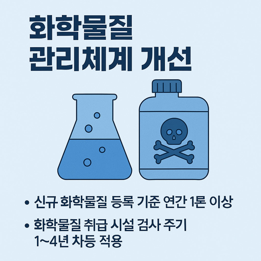 화학물질 관리체계 개선: 신규 화학물질의 등록 기준이 연간 1톤 이상으로 조정되며, 화학물질 취급 시설의 검사 주기가 위험도와 취급량에 따라 1~4년으로 차등 적용됩니다.