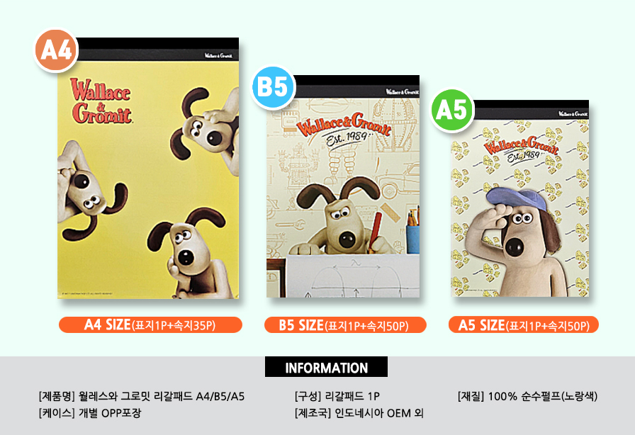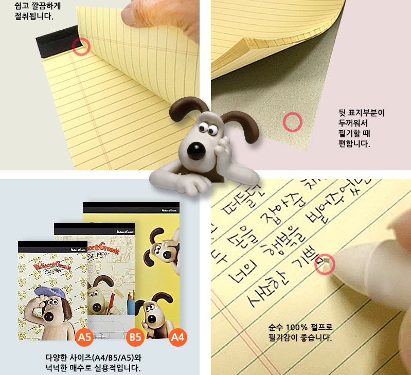 필기 후 쉽고 깔끔하게 절취가 가능하고 뒷표지를 한층 두껍게 제작해 필기의 편안함을 제공하며, A4, B5, A5 등 다양한 사이와 넉넉한 매수의 순수 100% 펄프로 필기감까지 더해주는 웰레스와 그로밋 #리갈패드(#메모패드)까지 추가 구성이 가능합니다.