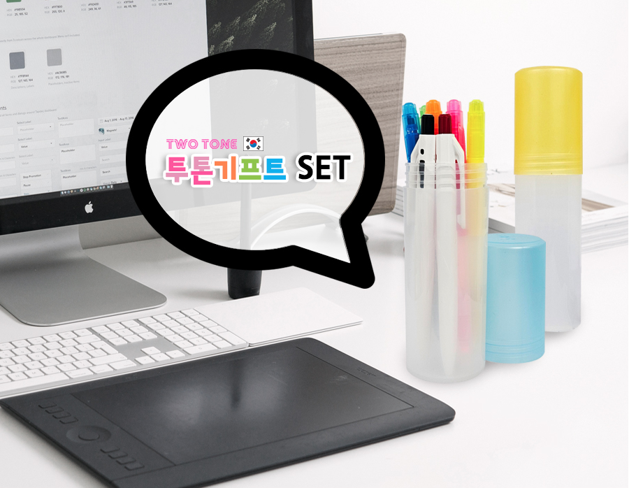 필기구를 보관하거나 이동도 가능한 원통형 케이스는 투톤 형으로 제작이 가능해, 밋밋할 수 있는 단색 원통케이스에 비해 보다 밝은 분위기를 연출할 수 있습니다.