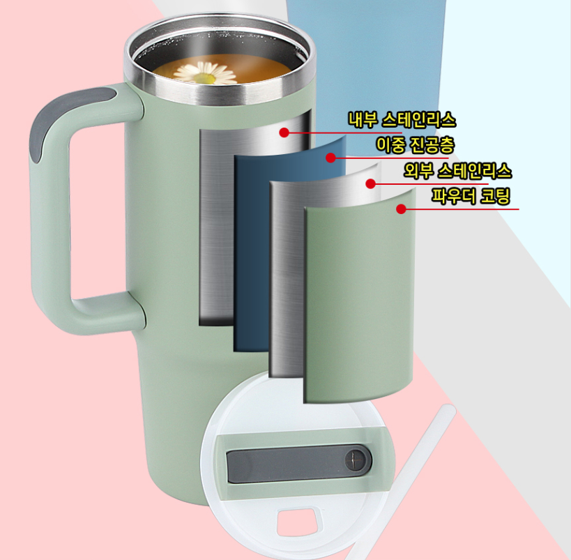 내부 스테인리스와 이중진공층, 그리고 외부 스테인리스에 마지막 공정인 파우더 코팅까지 총 4단계의 공정으로 제작되었으며, 보냉 보온 효과와 함께 크고 단단한 손잡이에 #미끄럼방지 고무처리로 그립감까지 한 단계 높인 제품입니다.