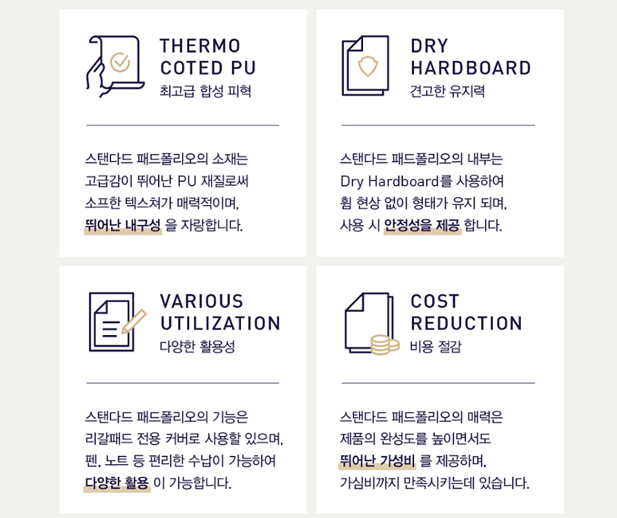 고급스러운 이태리식 습식 양장 바인더와 부드러운 필기감과 그립감을 자랑하는 볼펜 그리고 순수 100% 펄프로 필기감을 극대화한 실용적인 리갈패드로 구성되어 있습니다.