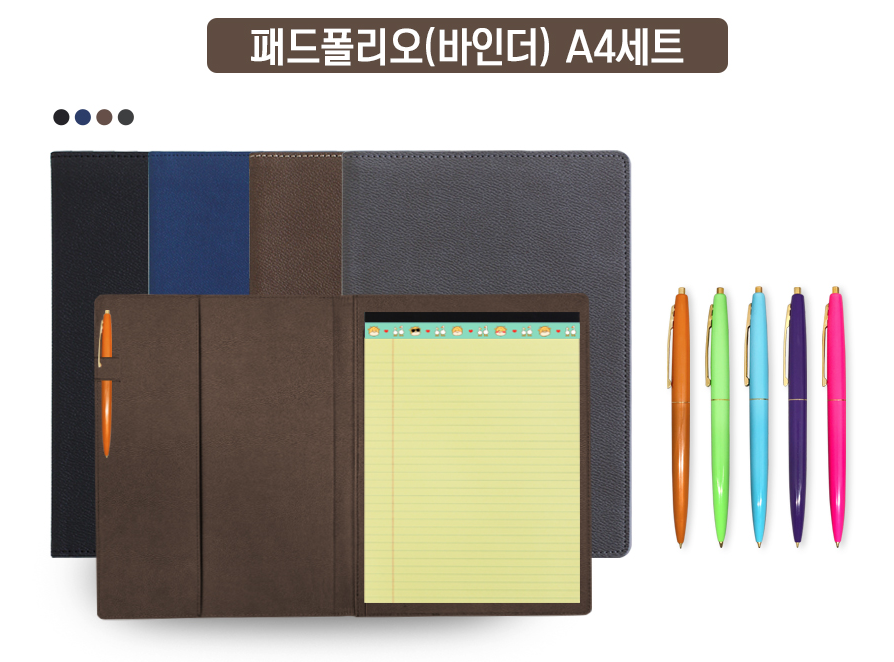 더욱 고급스러운 소재와 공정으로 제작된 패드폴리오 바인더 세트는 수공정으로 제작 후 약칠로 마감하여 고급스러움이 한층 돋보이며, 부드러운 필기감과 그립감은 볼펜과 100% 펄프로 제작된 우수하고 실용적인 리갈패드로 구성되어 있습니다.