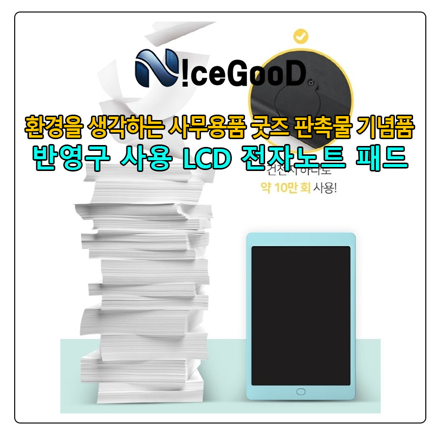 나이스굿 친환경 LCD 전자노트는 반영구적으로 사용가능한 지속가능한 전자노트로, 배터리 교체로 전용펜의 #부드러운 필기감과 슬림한 1Cm도 안 되는 #슬림한 9mm 두께와 #원클릭삭제 버튼, #지우개잠금 기능, 분실위험이 없는 #펜보관 홈 등 사용자의 편의를 모두 고려한 추천상품입니다.