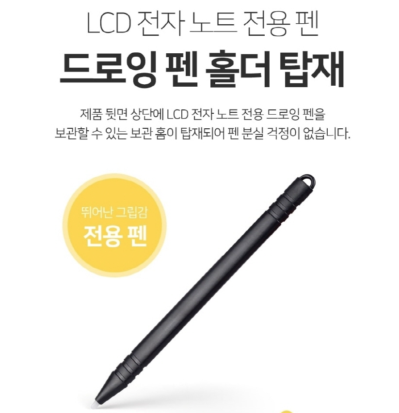 LCD 전자노트 전용펜 드로잉펜은 제품 뒷면 상단에 보관이 가능한 홈으로 탑재되어 있어 펜 분실 걱정이 없이 간편하게 탈착해서 사용과 보관이 가능합니다.