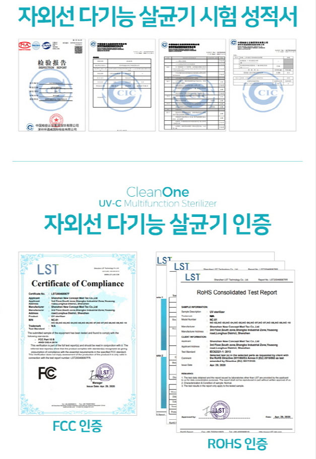 자외선 다기능 살균기 시험성적서와 공신력있는 살균인증서를 보유한 제품입니다.