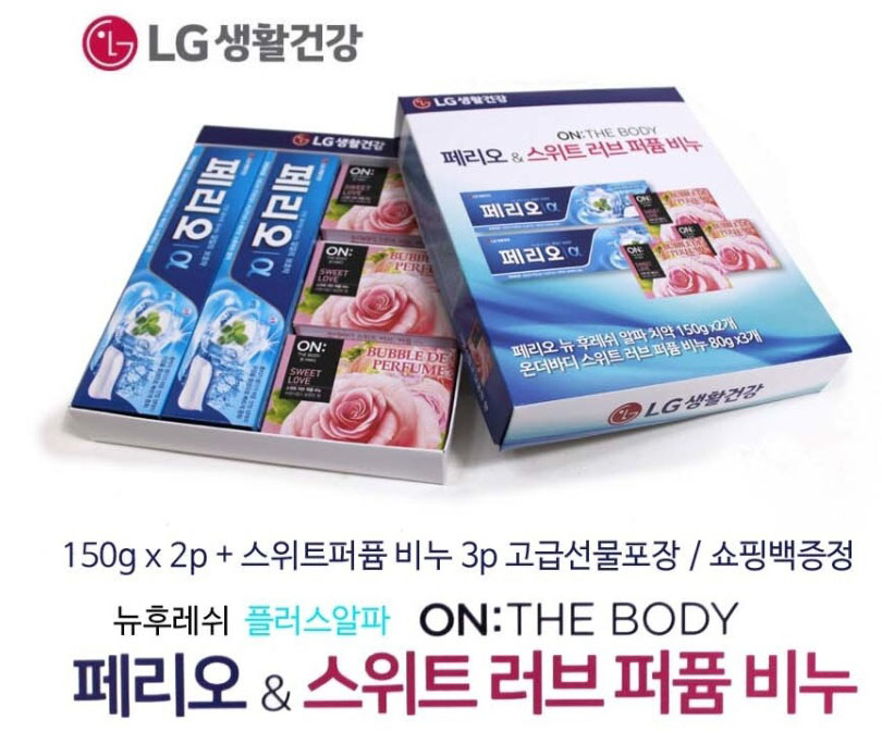 LG생활건강 아름다운 마음 선물세트는 페리오치약 2개와 스위트 러브 퍼퓸 비누 3개, 총 5개로