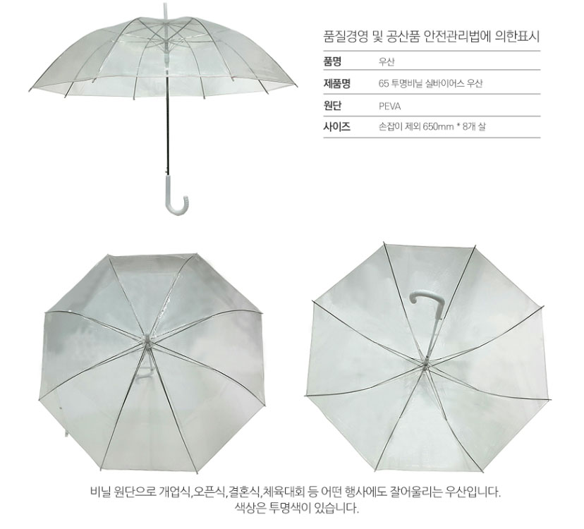 앞서 소개드린 안전우산이 어린이, 교통안전 등에 중점을 둔 투명우산이라면, 위의 투명우산은 야외 행사, 관람, 공연 등에 중점을 둔 전체 투명 우산입니다.