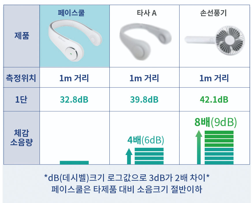 타사제품 및 일반 손선풍기 기준으로 비교했을 경우 타의추종을 불허하는 소음기준은