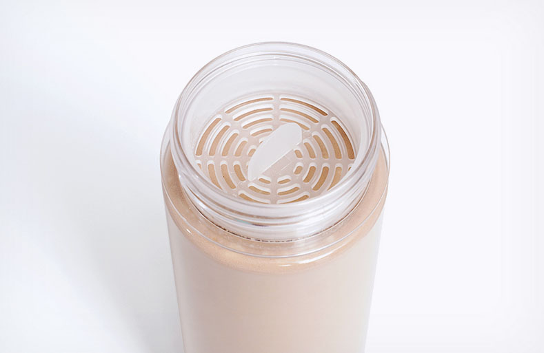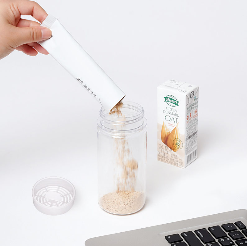 중간에 손잡이가 있어 잘 섞인 음료나 선식, 단백질(프로틴)가루 등을 섞은 후 위생적으로 분리할 수 있는 자체 개발 디자인 적용