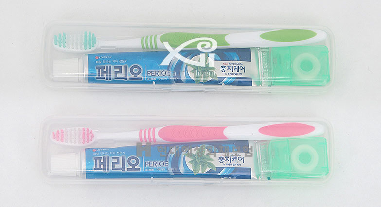 구강관리용품 페리오세트는 페리오 뉴 후레쉬 알파 치약 50g, 치실 15M, 미세모칫솔, 하드케이스로 구성이 되어 있습니다.